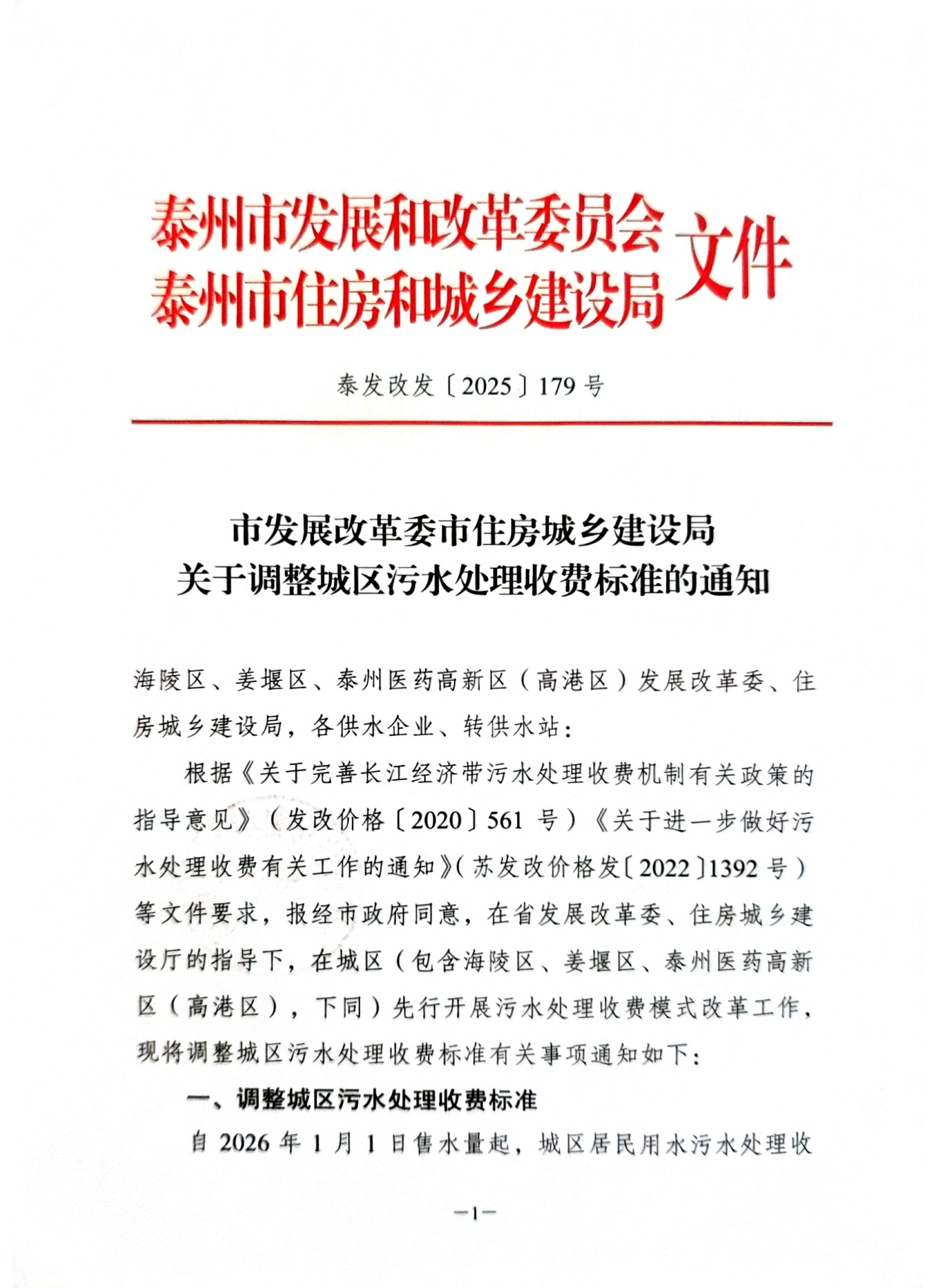 海陵区、姜堰区、泰州医药高新区(高港区)发展改革委、住房城乡建设局,各供水企业、转供水站:
