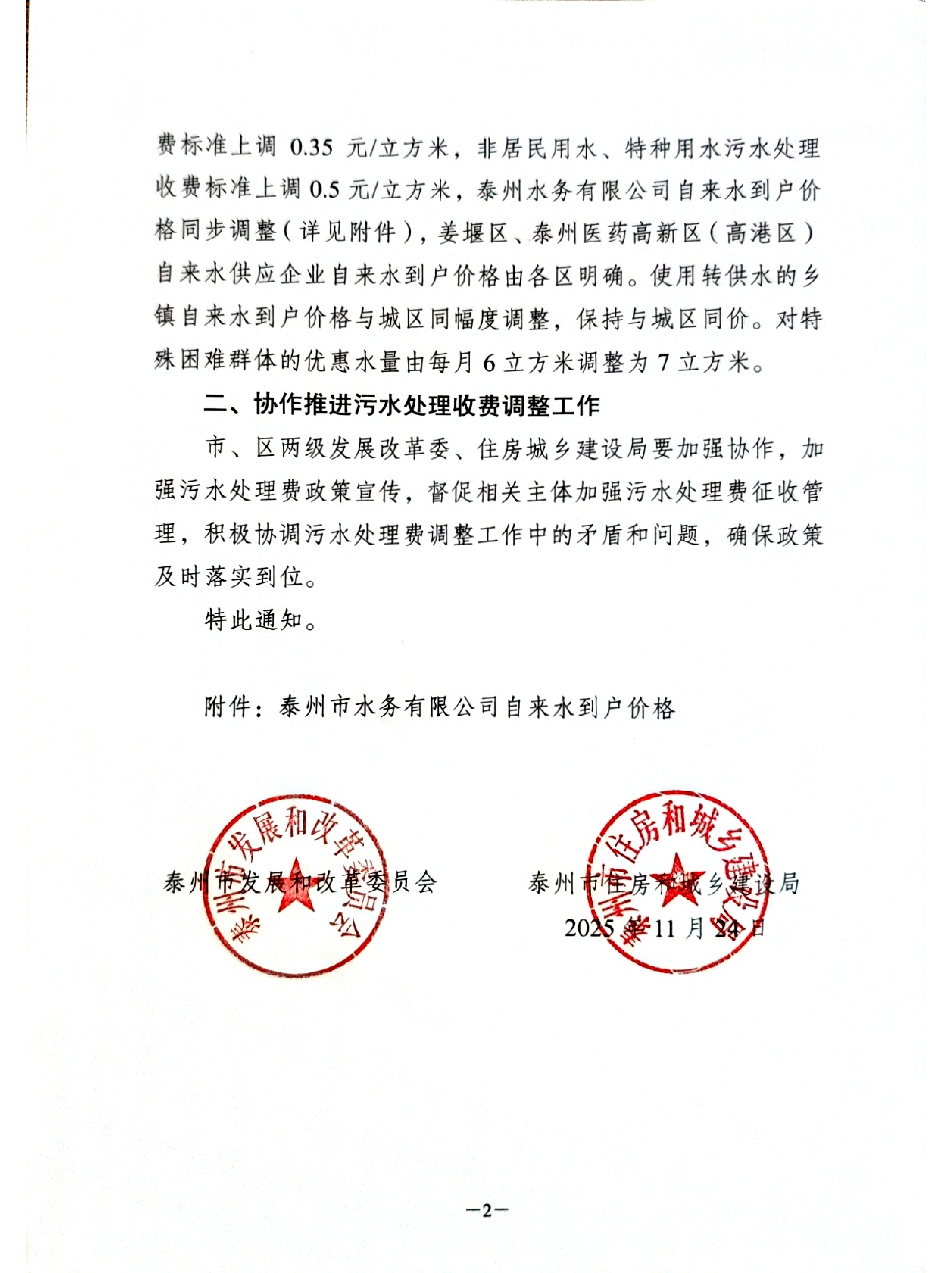 自2026年1月1日售水量起,城区居民用水污水处理收费标准上调0.35元/立方米,非居民用水、特种用水污水处理收费标准上调0.5元/立方米,泰州水务有限公司自来水到户价格同步调整(详见附件),姜堰区、泰州医药高新区(高港区)自来水供应企业自来水到户价格由各区明确。使用转供水的乡镇自来水到户价格与城区同幅度调整,保持与城区同价。对特殊困难群体的优惠水量由每月6立方米调整为7立方米。