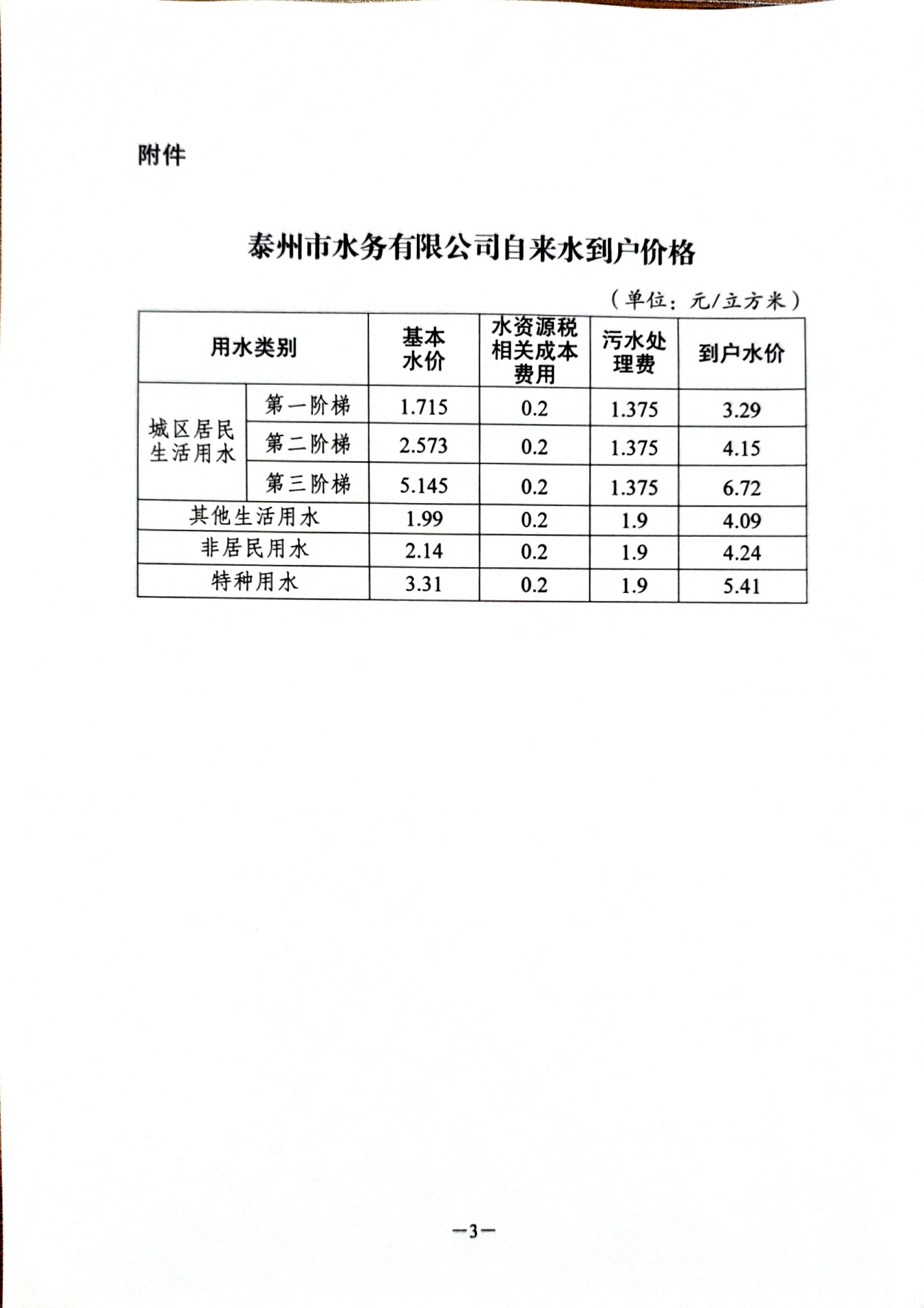 附件:泰州市水务有限公司自来水到户价格